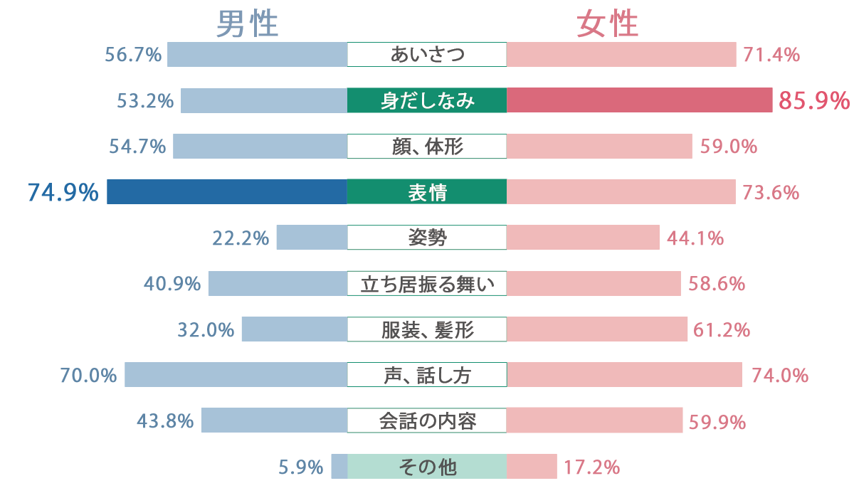 初対面の異性の印象を判断するポイントとして、「表情」が一番多い男性に対し、女性は「身だしなみ」が85.9%と一番多い結果となっています。