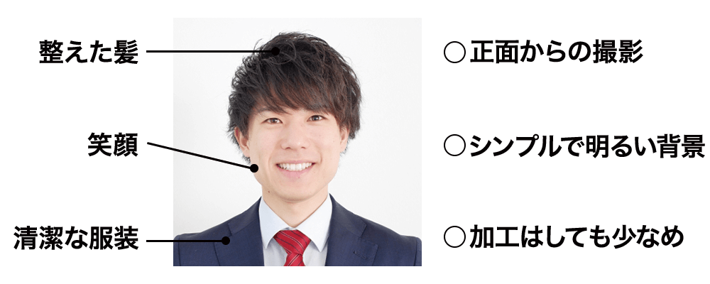 髪や服装を整え、笑顔を意識して明るく背景がシンプルな場所で撮影しましょう!撮影する際は、下や上からのアングルではなく正面から撮影しましょう。また加工のしすぎやポーズによっては、マイナスな印象を与えてしまうこともあるので注意しましょう。