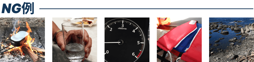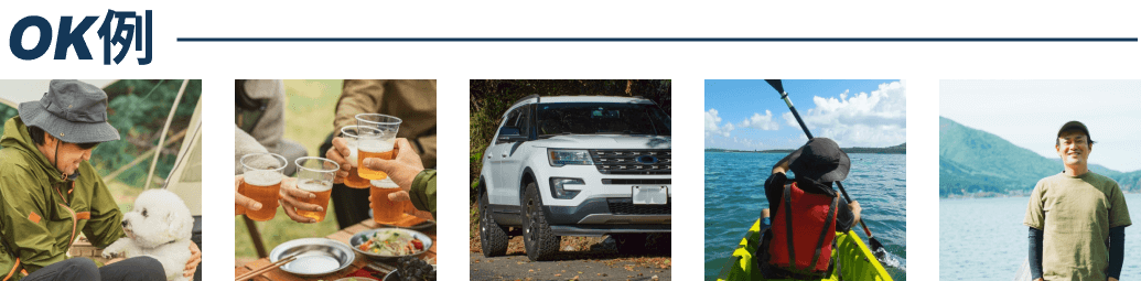 趣味の写真などは、物や景色が部分的にしか写っていないと、それが何かがお相手に伝わりづらいようです。OK例のように広範囲が写った、一目見て何をしているのかが伝わる写真を意識して選びましょう!