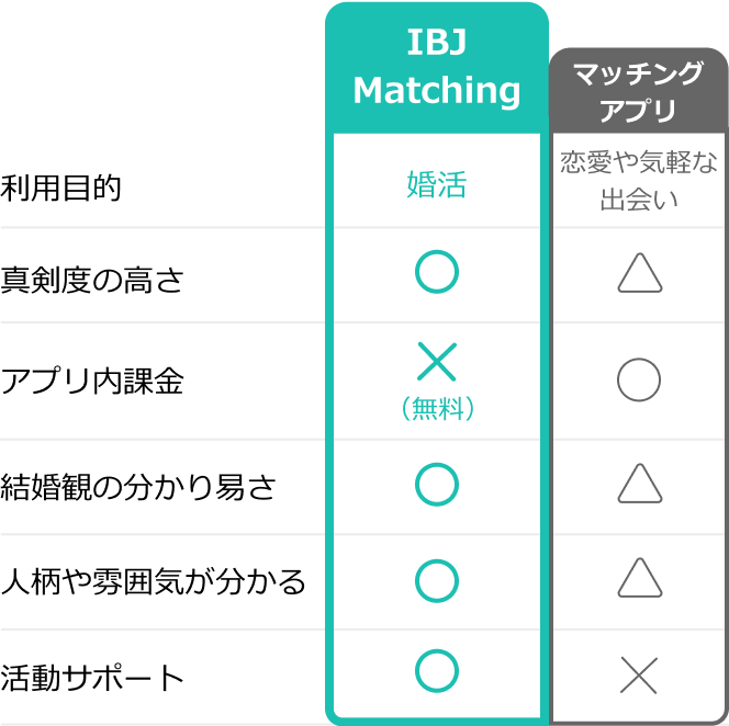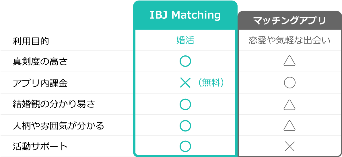 マッチングアプリは気軽に出会うことに向いているため、ユーザーによって出会う目的は様々ですが、IBJ Matching公式アプリは、お互いが婚活を前提としているので、出会う目的が明確です。