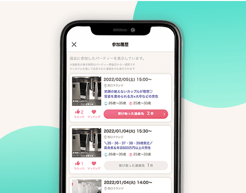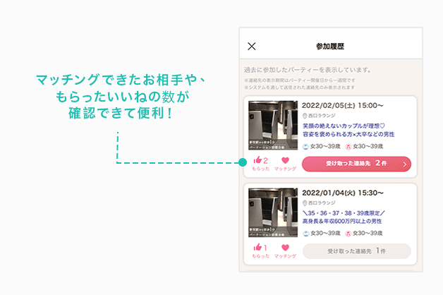 【マイページ】の「参加履歴」から、ご自身が参加されたパーティーを確認できます!もらったいいねの数やマッチング結果も後から見直しができます。
