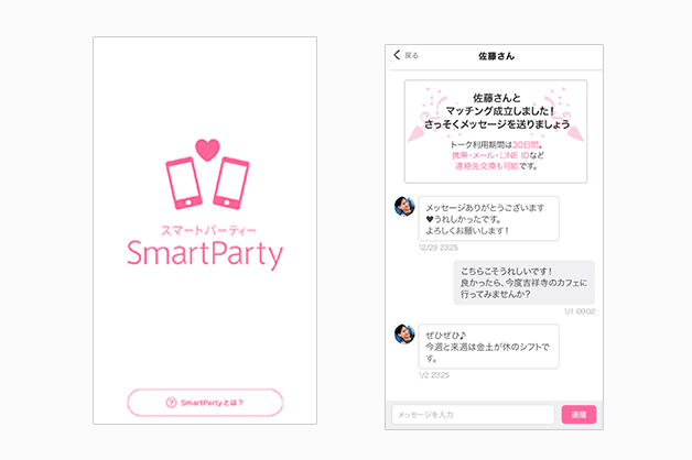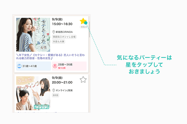 アプリからパーティーに申し込むだけで、異性と出会うことができます。