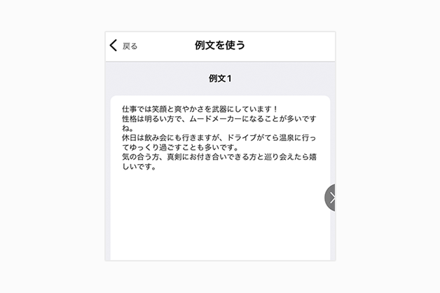 POINT自己紹介がマッチングのカギ!パーティー中の会話のきっかけとなるのがプロフィールの「自己紹介」!自分を知ってもらうために、趣味や好きなことを具体的に書きましょう。作成に困ったら、「例文を使う」機能を使ってみてくださいね。