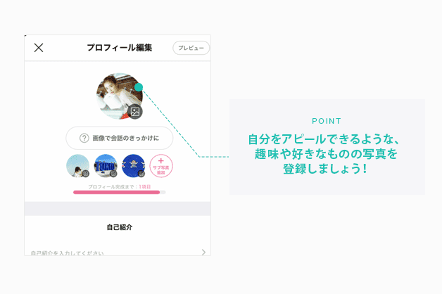 写真を登録することによってマッチング率がアップ!プロフィール写真はアプリから簡単にご登録いただけます。ぜひご自身の素敵な顔写真や趣味などの写真でアピールしましょう。