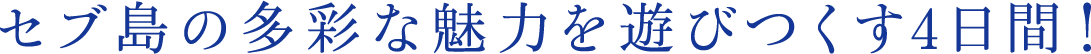 ツアー中は楽しみつくせないほど多彩な企画をご準備しました。アイランドピクニックでは、選べるアクティビティでセブの海を全身で感じましょう。2日めにはセブ名物の稀少なジンベイザメウォッチングも。
