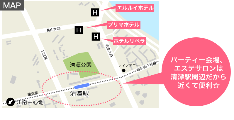 パーティー会場からも近くてリーズナブル!さらに『ホテル⇔エステサロン』の送迎付き!