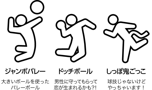 - A.大きなボールを使ったバレーやみんなが楽しめるドッヂボールなど、運動神経を必要としない競技もございますので、運動が苦手な方でもお楽しみ頂けます♪