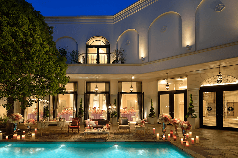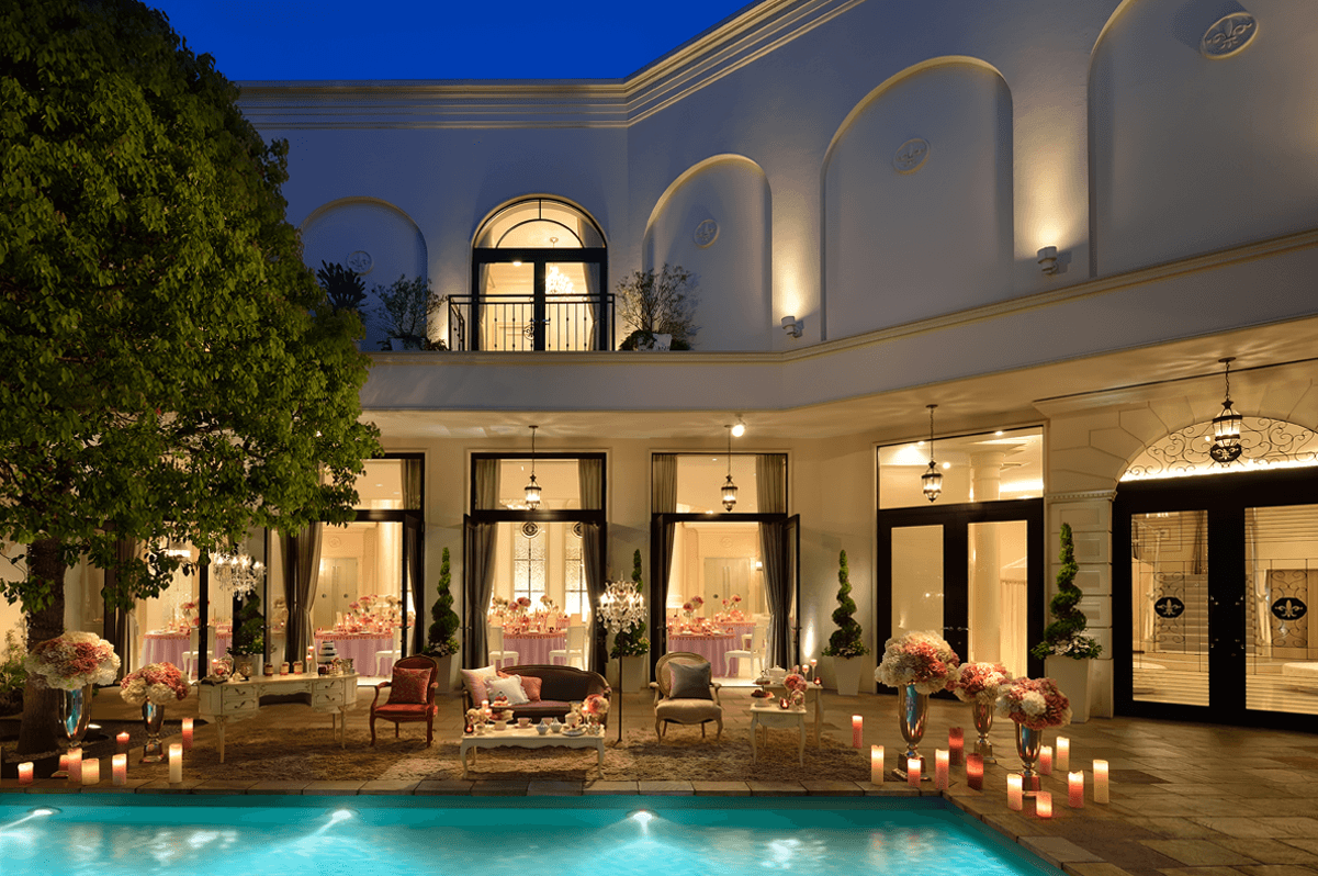 『鐘』をモチーフにした素敵なシャンデリアやガーデンプールが特徴的です♪女性は『白』、男性は『白』か『黒』のドレスコードでお越しください♪