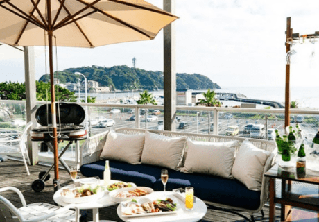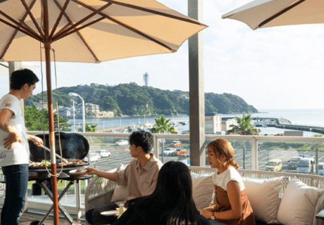 江の島の海が望められ、開放感のある屋上でBBQ。