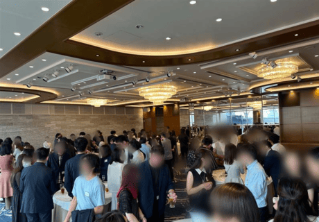 華やかな披露宴会場にグラスを掲げる瞬間、