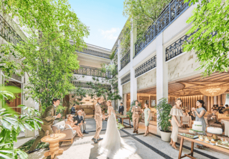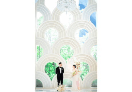 華やかな披露宴会場にグラスを掲げる瞬間、