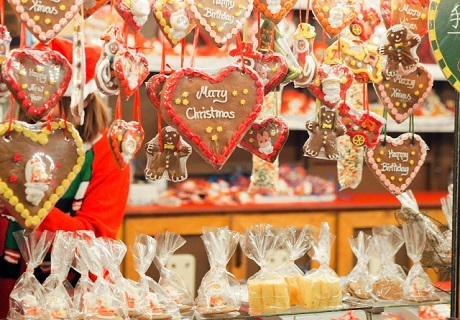 ホットワインやビール、ソーセージなどのフード店やクリスマス雑貨など、
