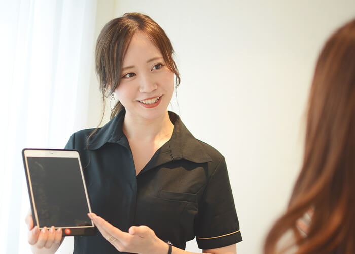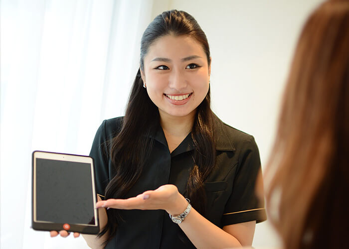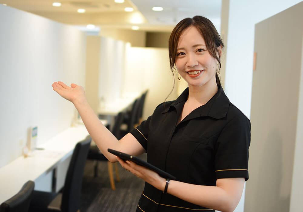 お客様1人1人と会話をしながら、スムーズに受付を行います。