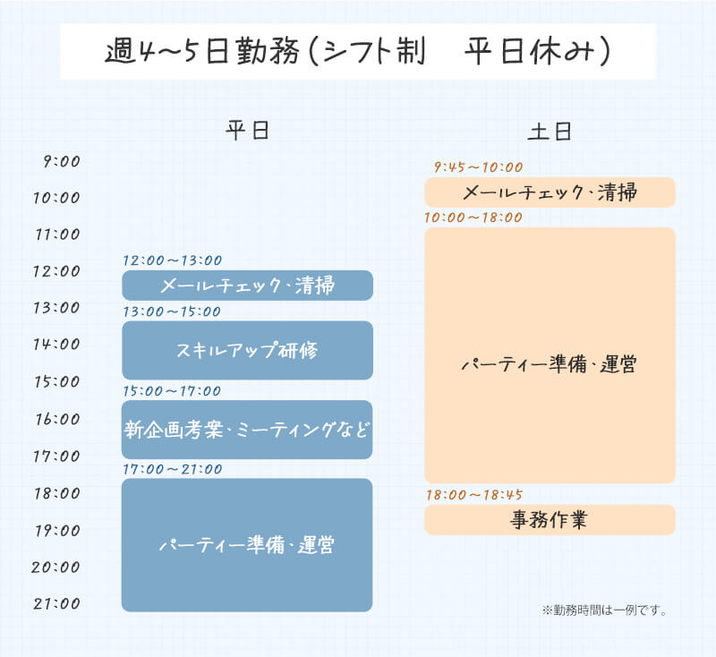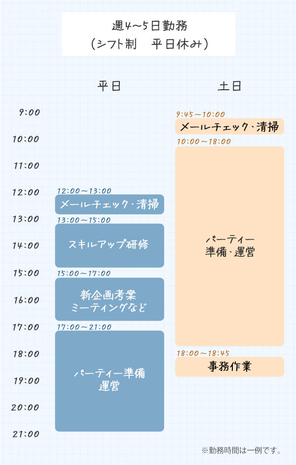 | 勤務時間 | ▼下記いずれかのシフト制(実働8時間) ※「平日」「土日祝」など、日によってシフトは変わります。 |