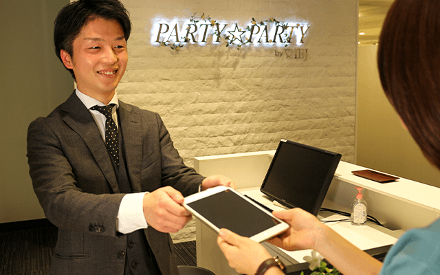 お客様に安心感を与える立ち居振る舞い、パーティー運営ができるかどうかを審査します。運営の審査では、お客様のお出迎え・受付・席案内・進行アナウンス・結果発表・お見送りを1シチュエーションとし、ロールプレイングを行います。